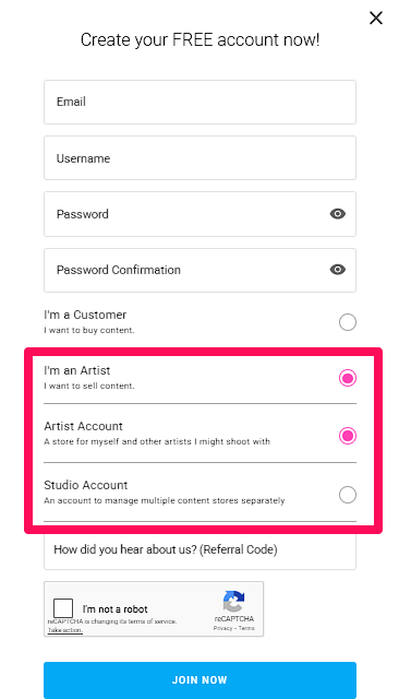 2. Select between an Artist Account or Studio Account.