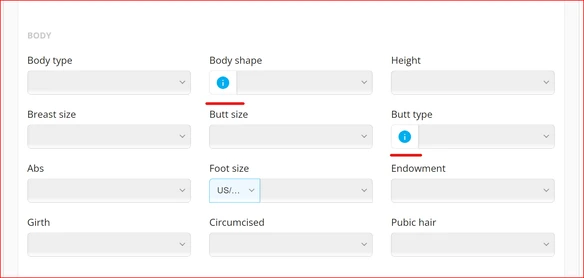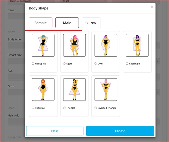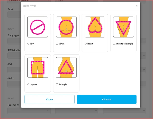 For Body Shape and Butt Type attributes, Artists will see images to help them with their selection by clicking on the blue info icon and can choose the body and/or butt type for that Artist.