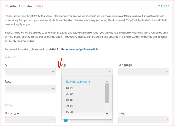 For each attribute, an Artist can select an option in the dropdown box. If an attribute is not applicable to the Artist, they can select "Skip/No Applicable".