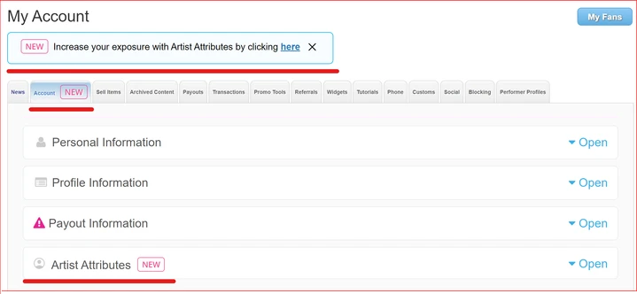When Artist Attribution is released, the Artist will be able to update their Attributes via the "Account" tab and then open "Artist Attributes.