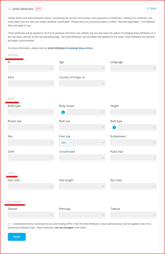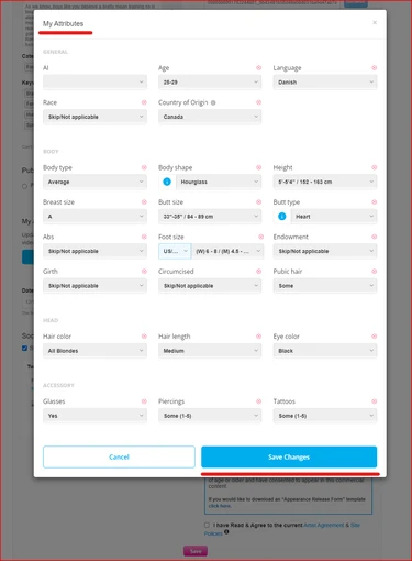 Artist Attributes is a set of physical characteristics that an Artist has, such as age, country of origin, race, hair color, body type, height, tattoos, etc. This will help assist members in searching for specific attributes that they like.