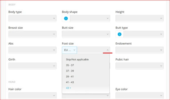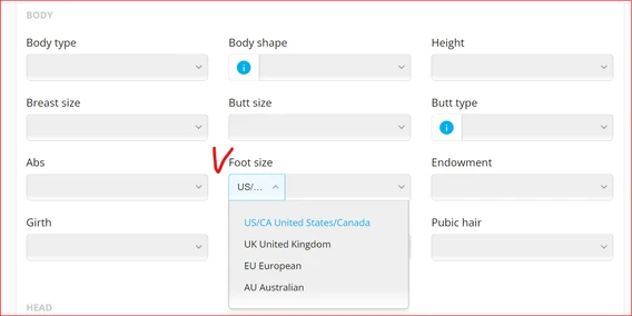 For the Foot Size attribute, Artists should select the country first and then the size. This is due to the difference in sizes between the US, Europe, UK, and Australia.