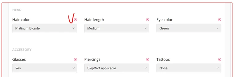 Artist's have the ability to remove the selected attribute option by clicking on the red cross icon above the selected attribute.