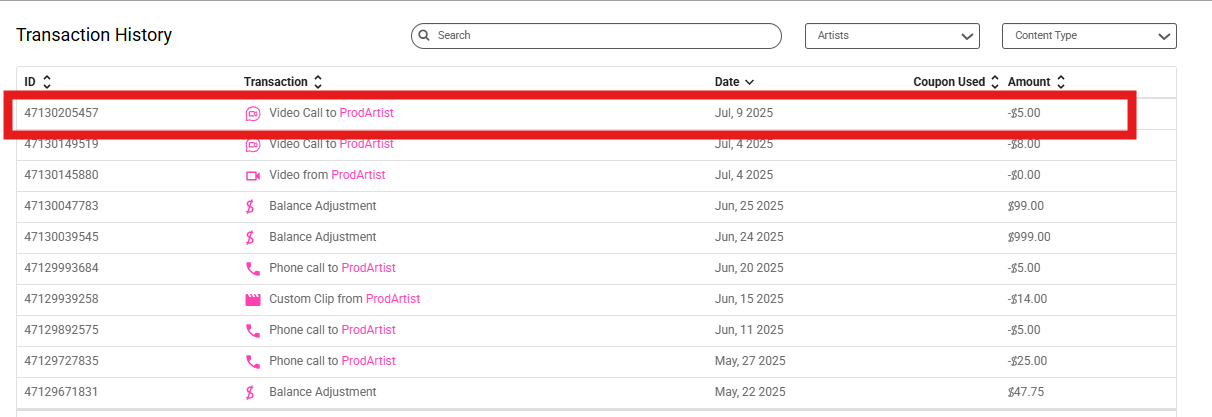 From your dropdown menu proceed to the page with all Artists available for video calling. Then select any Artist you like and initiate the call by clicking on the Artist’s avatar you wish to video call with.