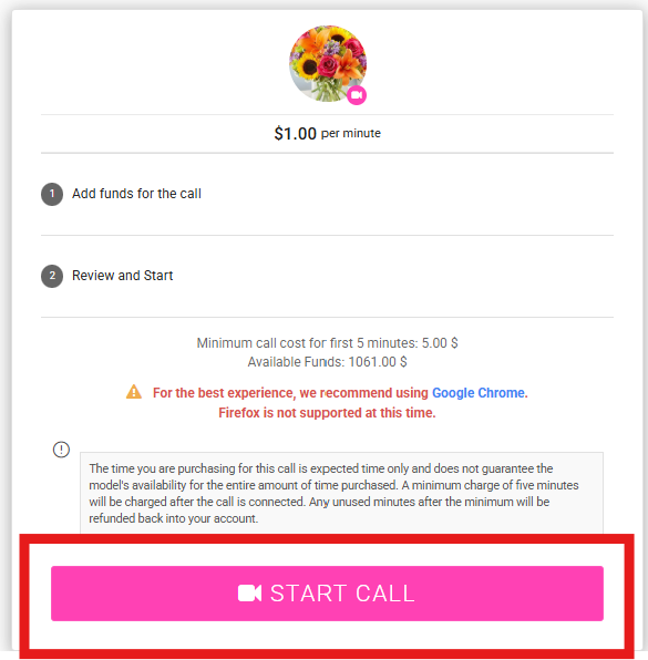 The minimum length of the call is 5 minutes, which means that a minimum charge of five minutes will be charged to start a video call. Any unused minutes after the minimum will be refunded back into your account. However, if your call lasts under 5 minutes, you will still be charged the minimum amount. In cases where the video call ends with remaining seconds in a partial minute, the duration will be rounded up to the nearest whole minute. For example, if a call lasts for 7 minutes and 20 seconds, it will be counted as 8 minutes and you will be charged for 8 minutes of a video call.