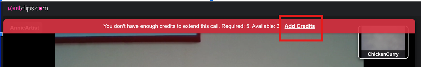 When you are about to run out of funds on a Video Call, you will see a warning in advance informing you about your low balance. You will also have an option to add funds to continue your video call. In case you run out of money and fail to add funds, the system will disconnect you with the Artist as soon as funds run out.